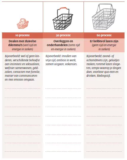 - Begin met het mandje van 60 procent. Schrijf in die kolom de dingen waarin jullie verschillen en waarvan je weet dat ze onveranderbaar zijn; je besluit nu dat je er geen tijd en energie meer in gaat steken.